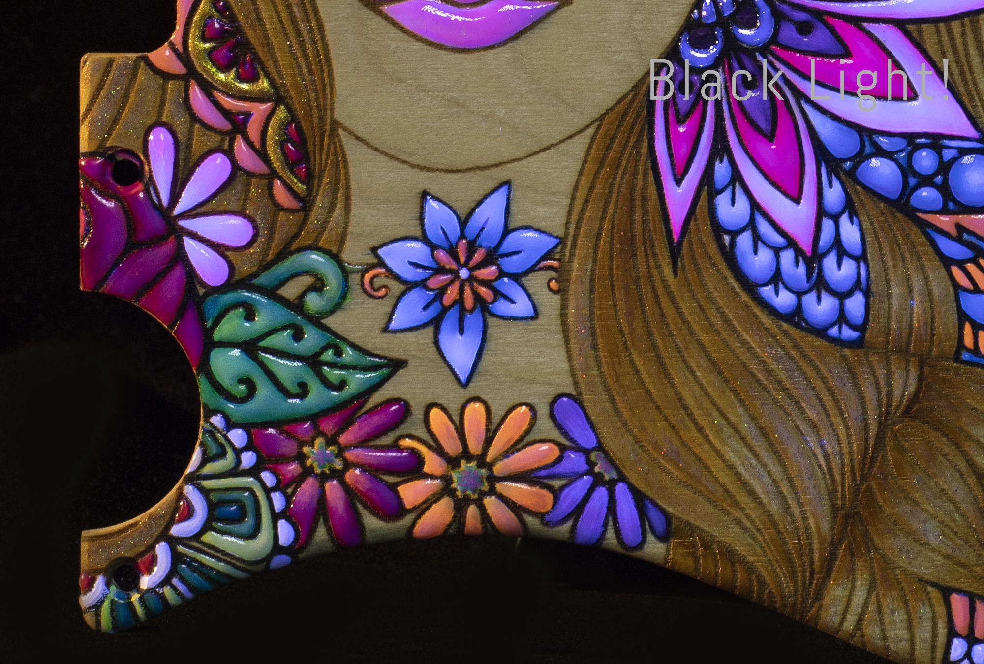 This telecaster scratchplate and matching control plate were made out of 3mm thick white birch wood. Wood plate was cut into shape and sanded, and mounting holes were nicely countersunk. The set was then engraved, and then lovingly hand painted in bright acrylic tones with special pigments added that glow in the dark. The whole painting was then very carefully hand painted again with ultra strong, clear and shiny resin. Each tiny detail, petal and leaf section was painted individually with a thick layer of resin to create a rich relief 3D texture that you can really feel under your fingers. Also, this resin is very hard and scratch resistant, so your wonderful pickguard will stay pretty and shiny for a very, very long time. It also fels very smooth and pleasant to touch :).