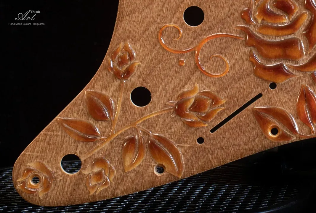 Finally, an additional layer of tranparent scratch resistant resin was applied on the flowers, as the final protection and glossy effect. The texture of this pickguard is very pleasant, featuring an interesting contrast between flat matte wood and raised and very smooth, silky roses and vines, which feel nice to the touch.
