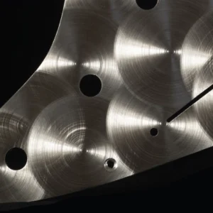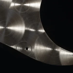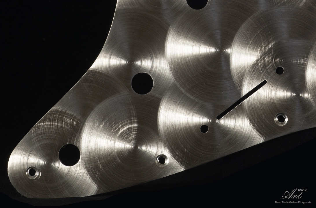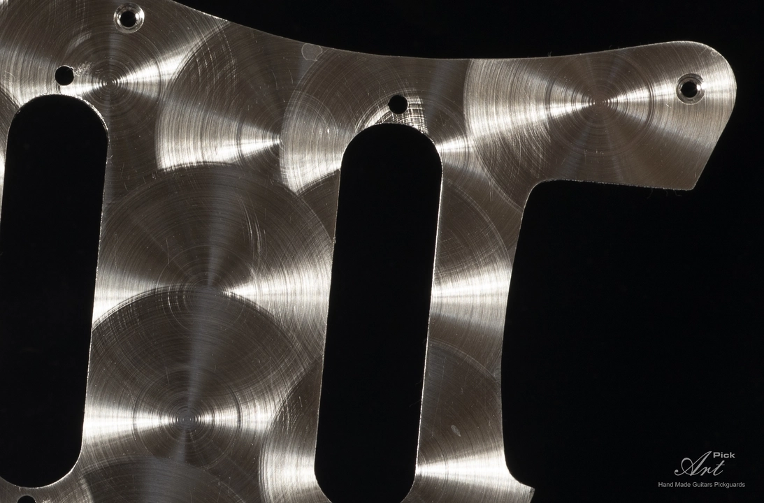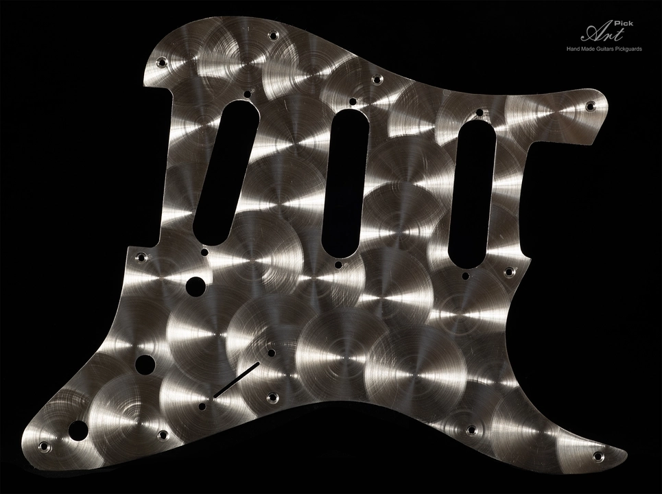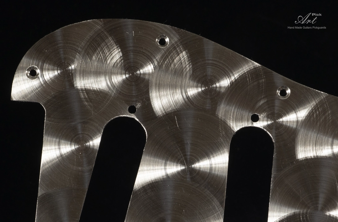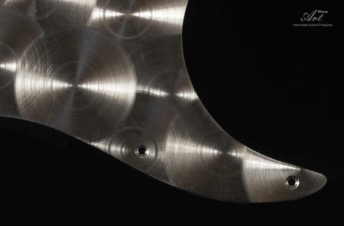 Processs: Stainless steel sheet was cut into form and then we used hand tools to grind a beautiful geometric pattern with overlapping circles whose texture resembles vinyl records with grooves, and this creates a magical holographic effect when you move the guitar – the circles are moving in the rhythm of your movements with the guitar, and little records spin and dance! It will look spectacular on your stratocaster.