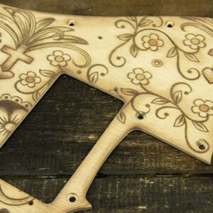 Cream tele deluxe scratch plate was made from 3mm thick 3-ply solid birch wood. The fun sugar skull design was first deep engraved to give your guitar a very cool, funky look. In order to give the pickguard a vintage look and feel as well, and make this piece unique, we hand painted it with elegant cream – beige and earthy shades of pastel pigments. Two coats of polyurethane-acrylic lacquer were applied to create the finish which is somewhere between matte and semi-gloss (satin).