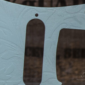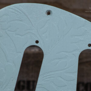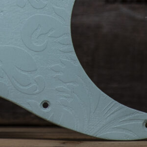 This Strat scratch plate was made from 3mm thick 3-ply solid wood. The elegant vintage leaves design was deep engraved to give your guitar a very posh look. In order to give the pickguard a special look and feel as well, we hand painted it in sonic blue/baby blue color with a matte finish. The final result resembles a luxury silk brocade fabric in classic sonic blue color.