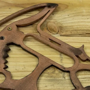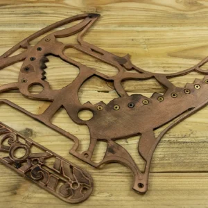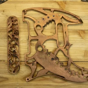 This one-of-a-kind tele scratchplate was made from 2.8-3mm thick 3-ply solid wood and 15 inbuilt brass parts taken from a 70-year-old family owned clock. The design was inspired by Star Trek Klingon ships and costumes. The pickguard plate and control plate were cut and engraved to form a Klingon grid that leaves parts of the guitar body exposed, giving the guitar a super cool and original look. After meticulous sculpting of inside edges with a file to give the grid angled lines, we painted it in copper and burnt it to create black shading, to make it look old and weathered after going through many Galactic Wars J. We also gave it a very special touch, by embedding the round brass elements into the grid holes. Finally, we applied two coats of semi-gloss varnish for protection.