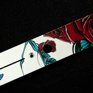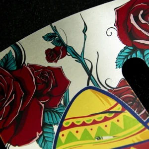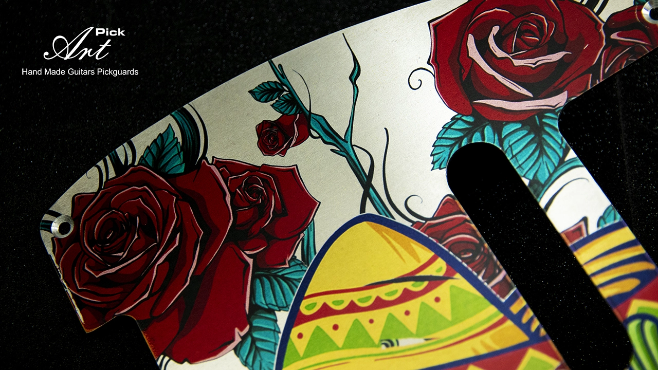 This tele scratchplate and control plate were made from 1.5mm thick anodized aluminum. This fun and colorful skull and roses design was laser transferred using our proprietary technology onto the elegant matte silver aluminum pickguard to give your guitar a very cool, funky look. The end result is the unique combination of sugar skull and roses in vibrant colors against the matte silver background with discrete shine.