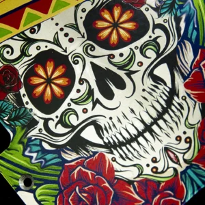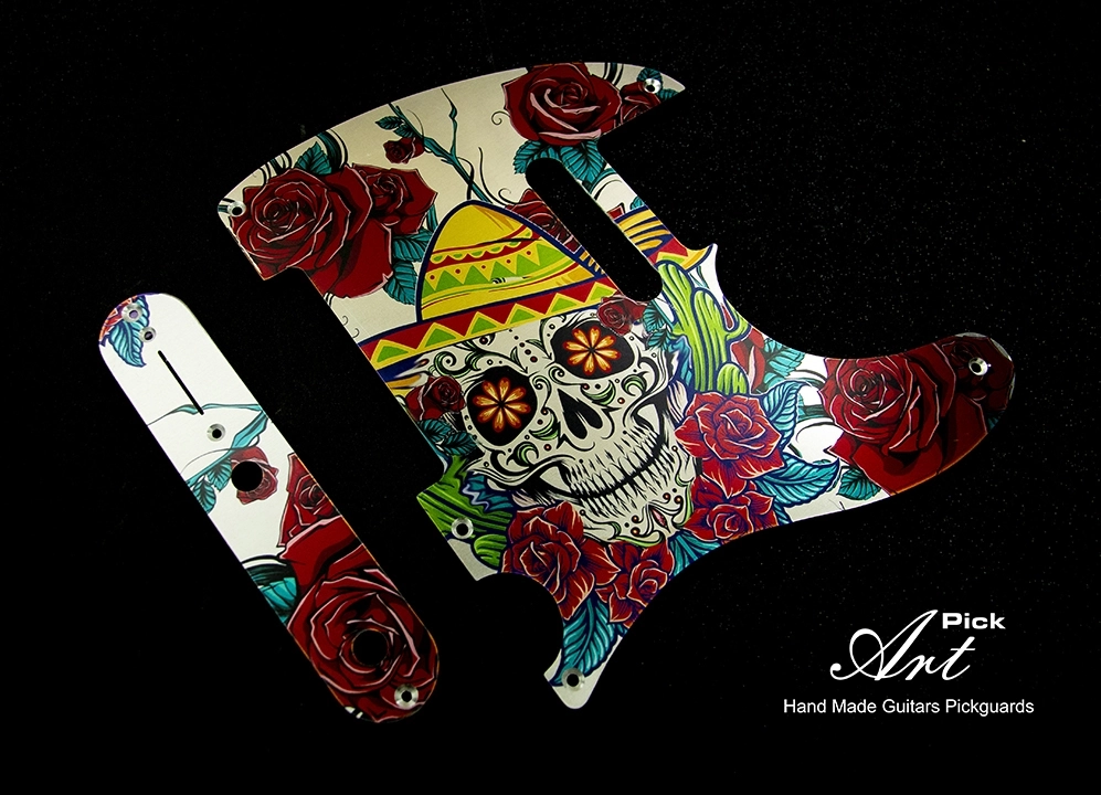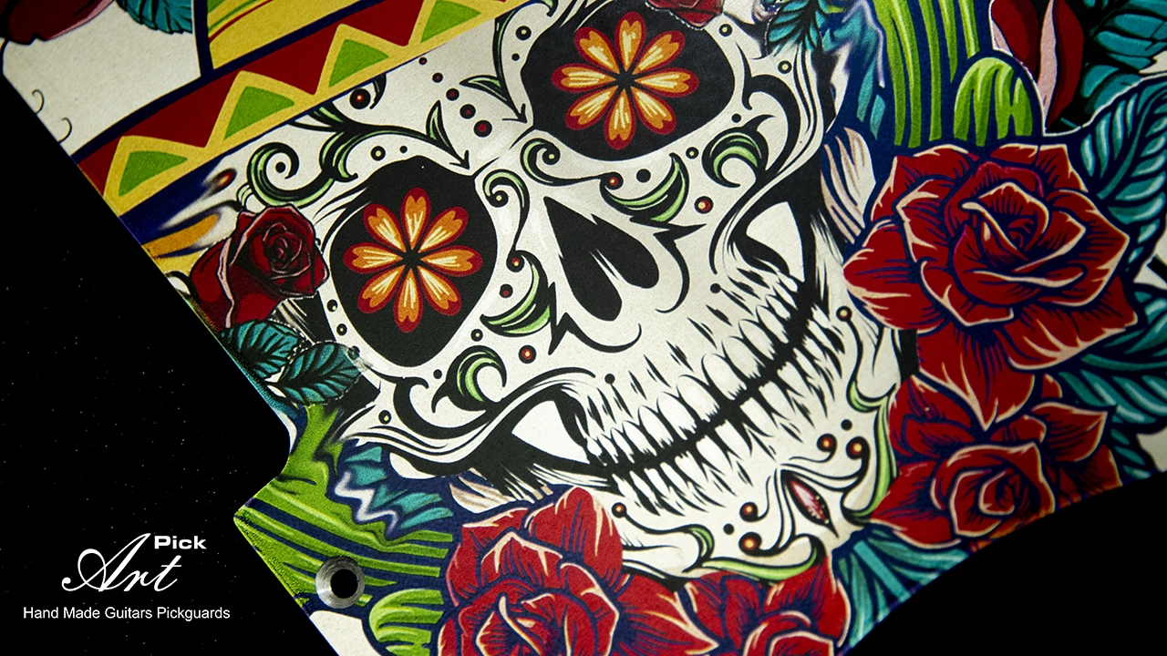 This Day of the Dead tele pickguard inspired by the beautiful imagery of Dias de los Muertos tradition looks awesome on most guitar bodies, giving them a funky look and feel. Your guitar will proudly wear it! Watch the video to see it shine from different angles.